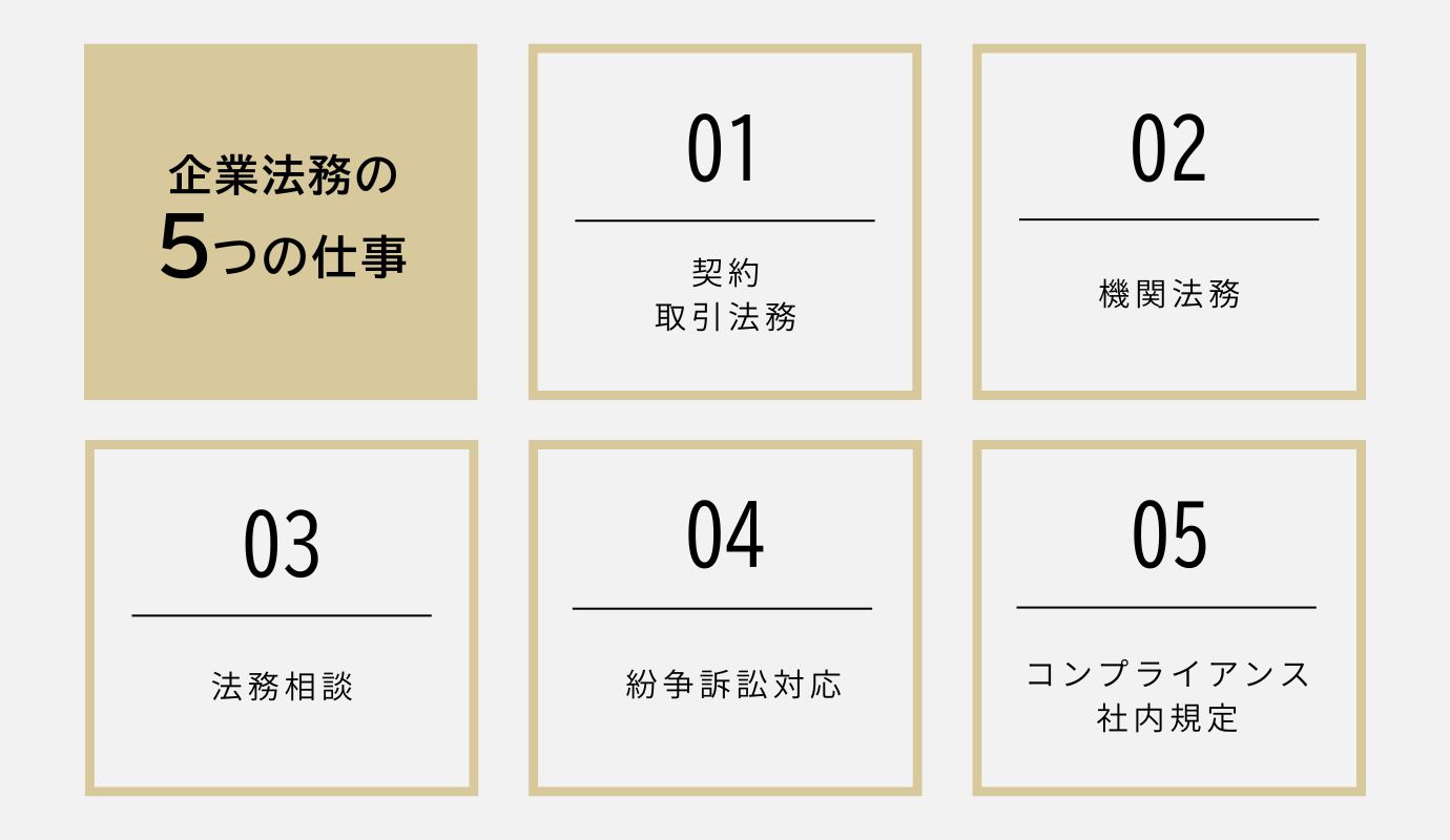 企業法務では、さまざまな業務を扱います。企業法務案件を扱う法律事務所の主な仕事内容を5つ解説しましょう。