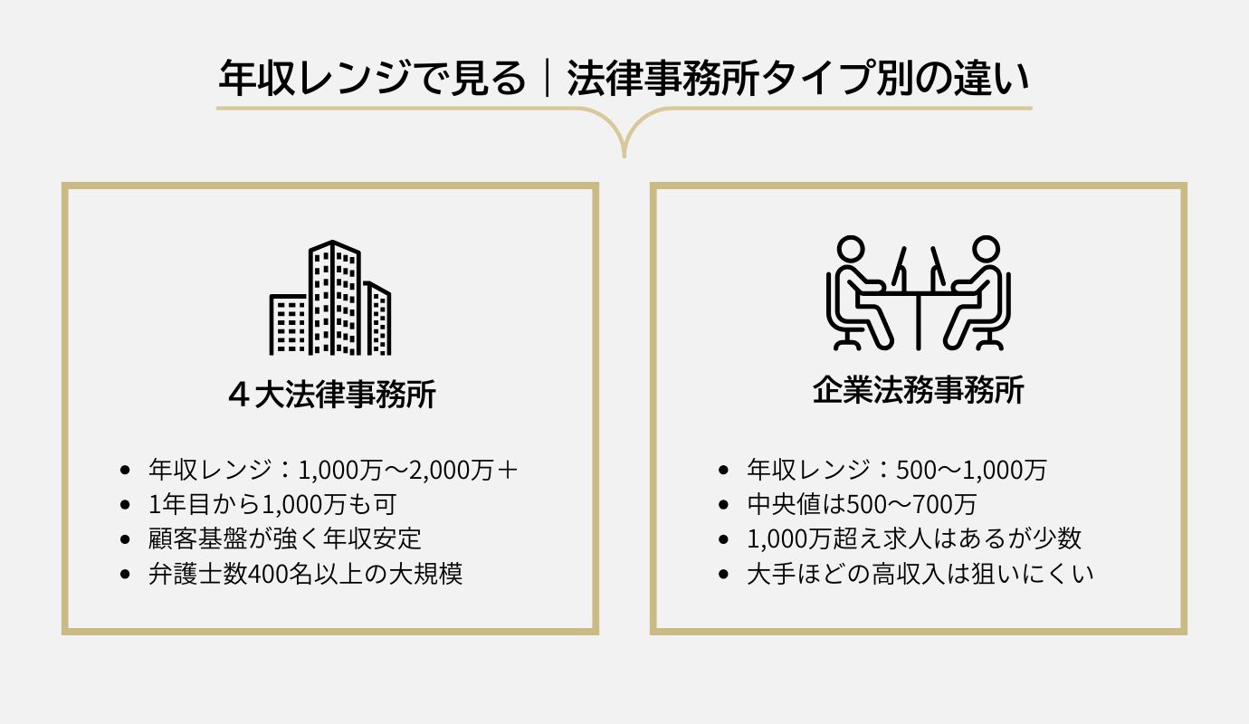 おおよそ500~1,000万円が目安となっていて、平均をとると500~700万円ほどだと言えます。まれに1,000万円以上の求人もありますが、珍しくそうあるものではありません。年収1,000万円で満足できるということであれば、大手4大法律事務所ではなくとも十分やっていけるでしょう。