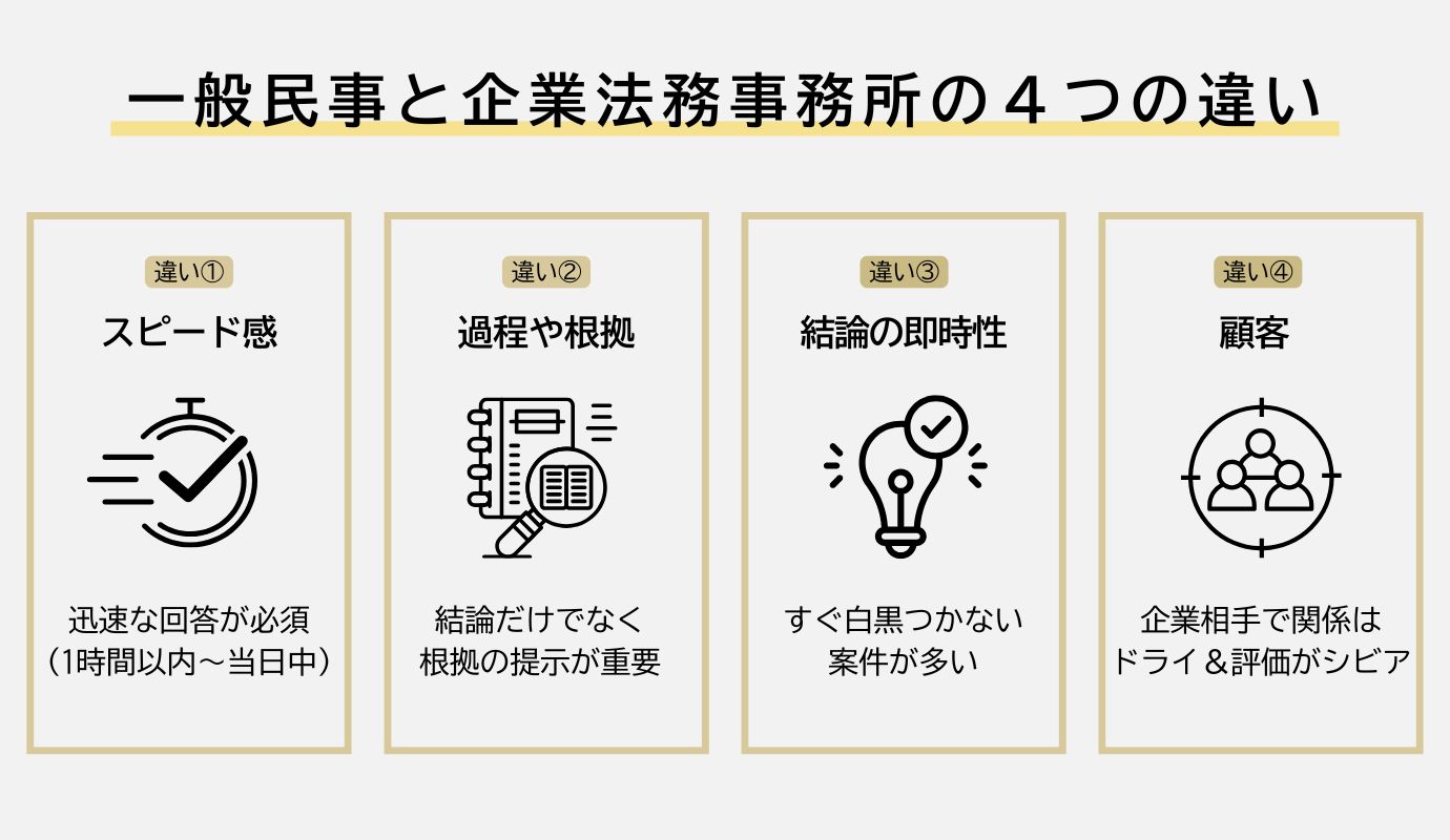 一般民事と企業法務は、4つの面で違いがあります。