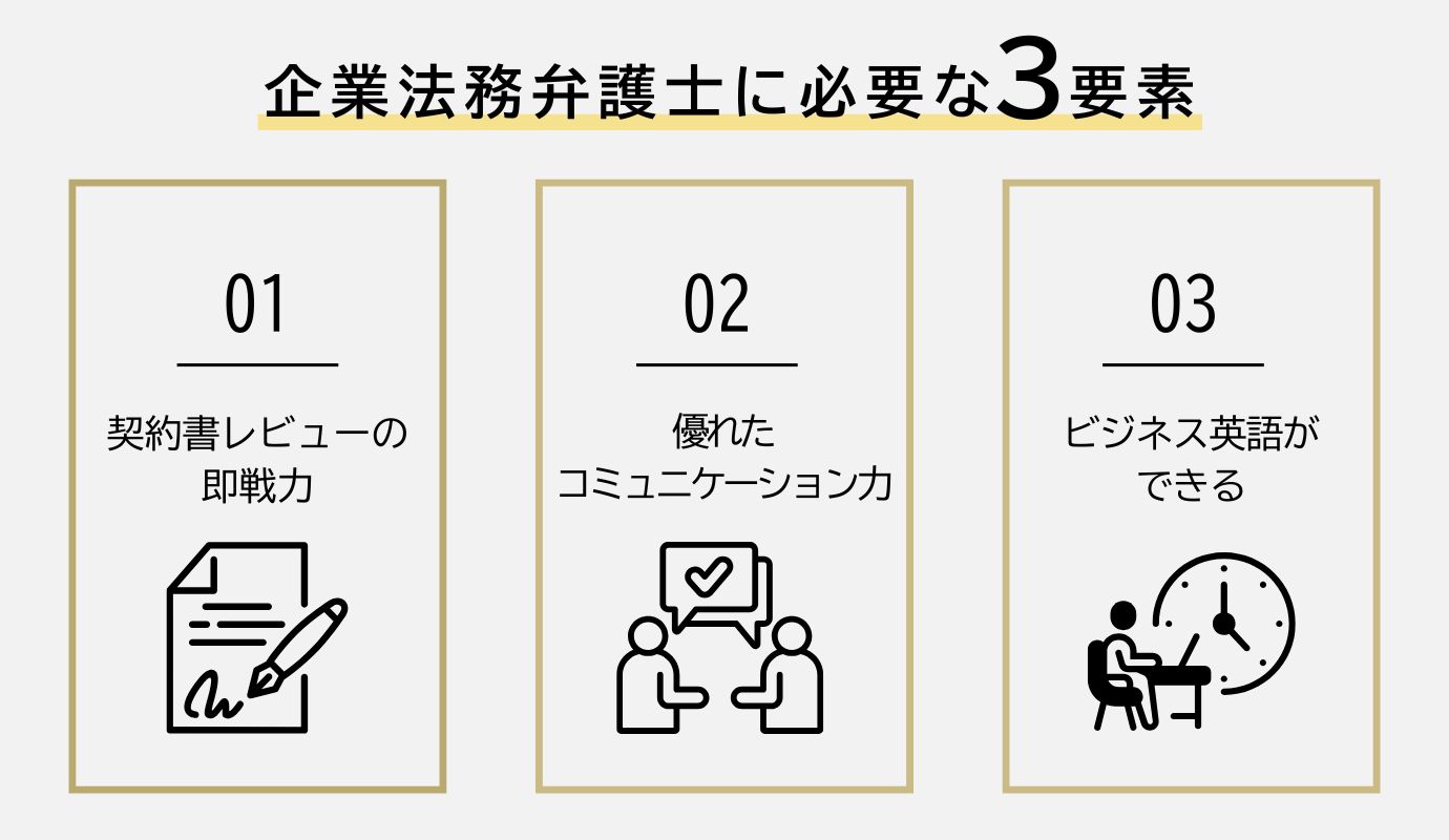 これらの違いを知った上で、自分は一般民事よりも企業法務に興味があるというケースも考えられます。そこで、企業法務を扱う法律事務所へ転職する際に求められる弁護士の特徴を3つ挙げてみましょう。具体的にどのように転職活動をしたらよいかもお伝えします。