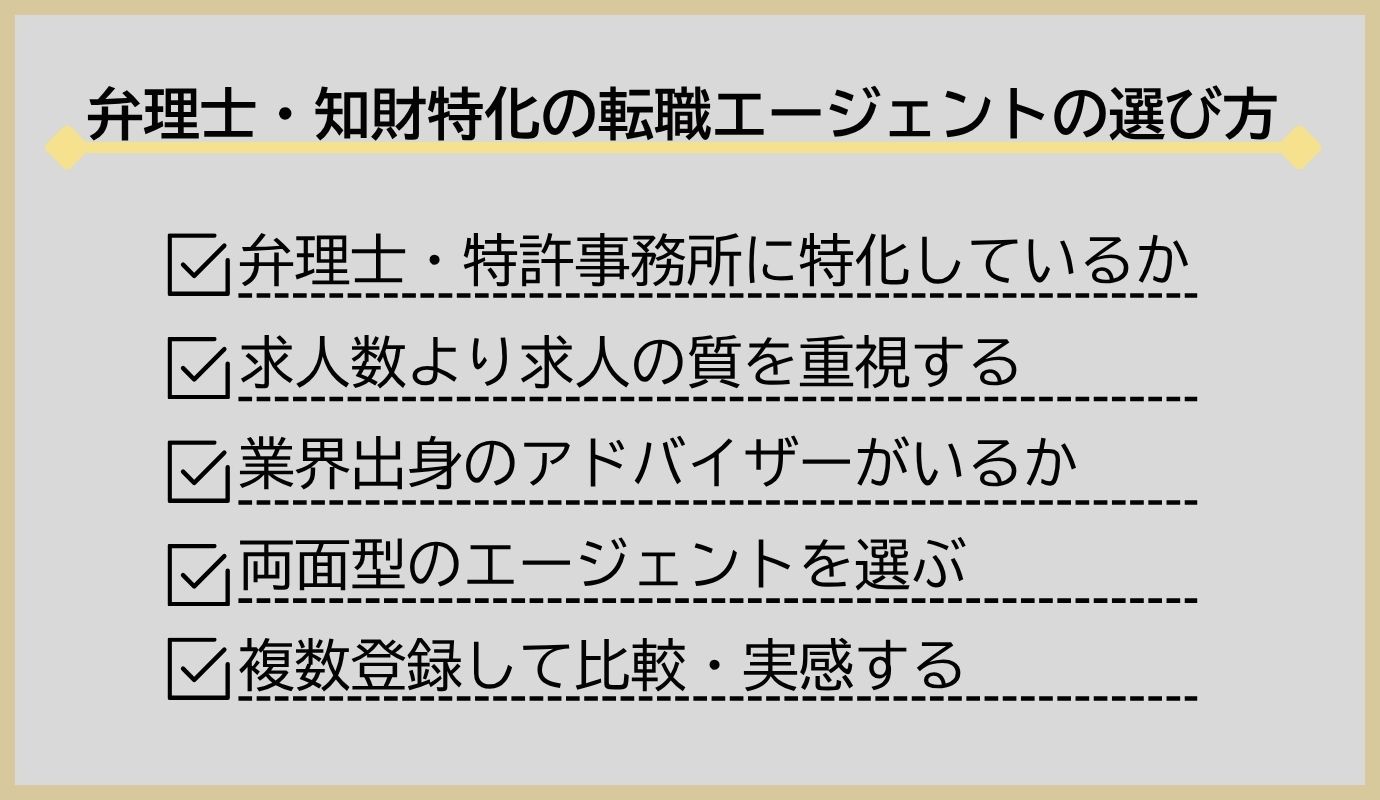 次に、弁理士・特許事務所に強い転職エージェントの選び方を解説します。