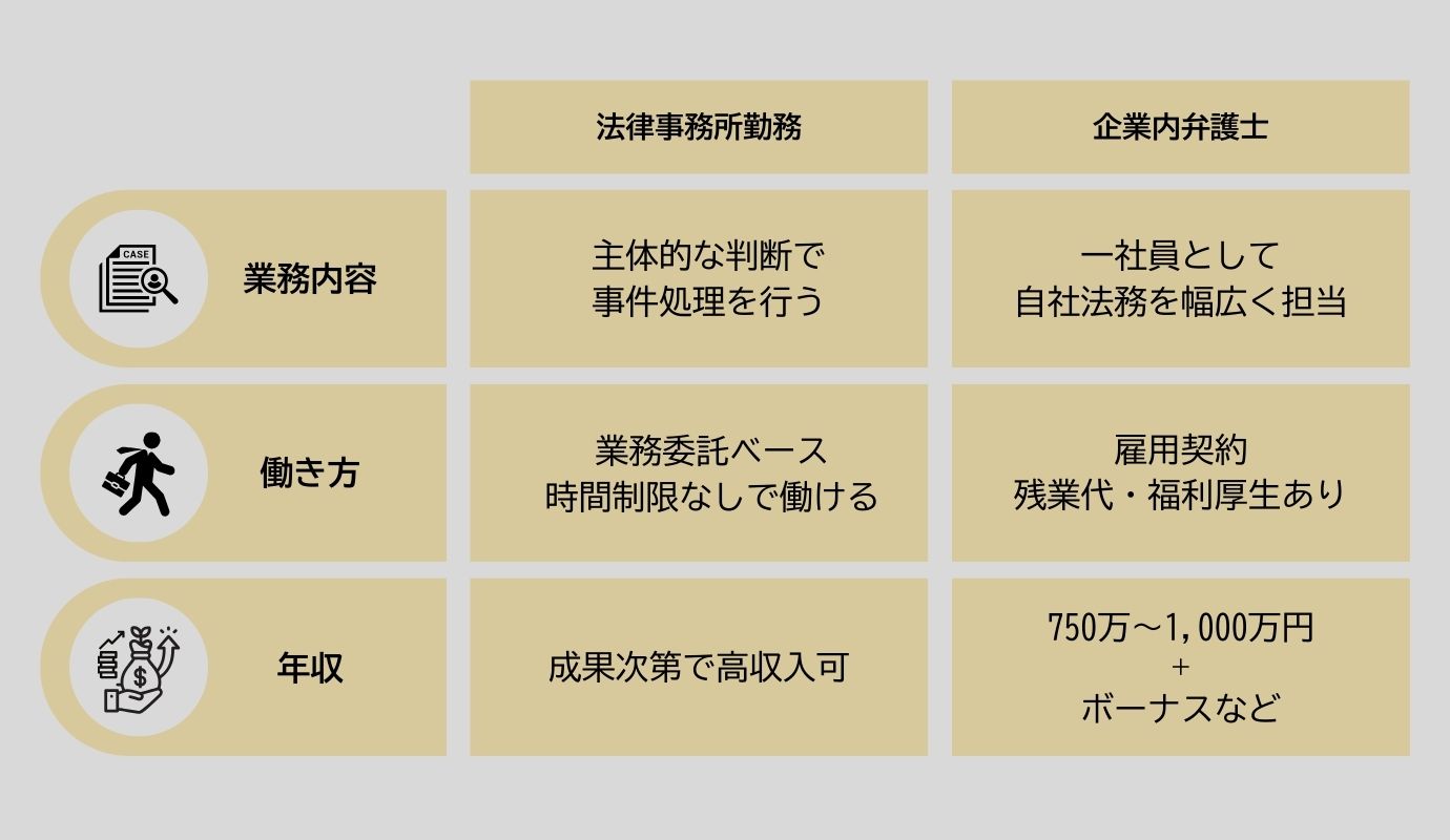 法律事務所の勤務弁護士と企業内弁護士では、様々な違いがあります。ここでは、業務内容、働き方、そして年収の3つの観点から解説していきます。