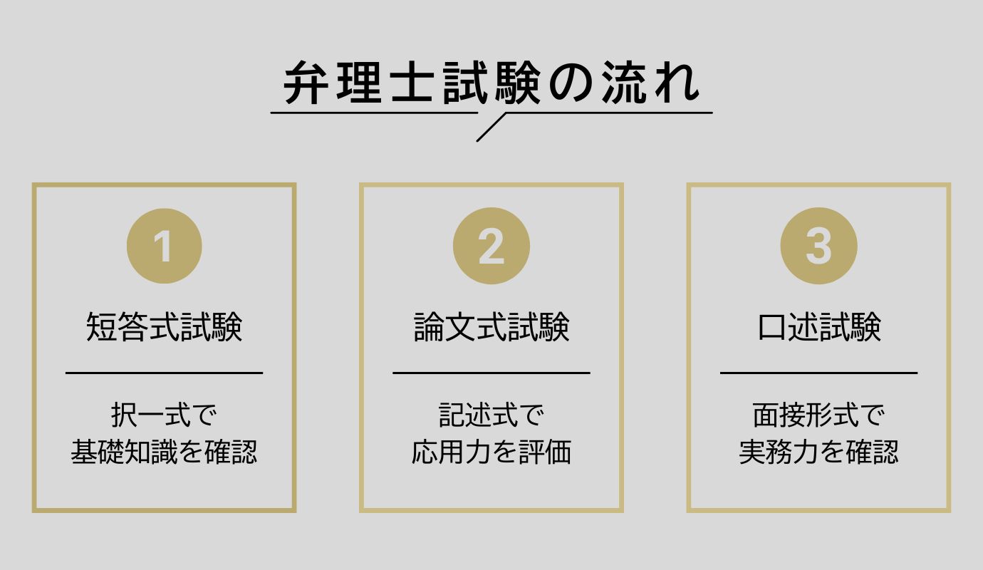 弁理士の試験は、短答式・論文式・口述の3段階で実施されます。短答式を突破した人だけが論文式へ進み、論文式も突破した人だけが口述に進めるという仕組みです。