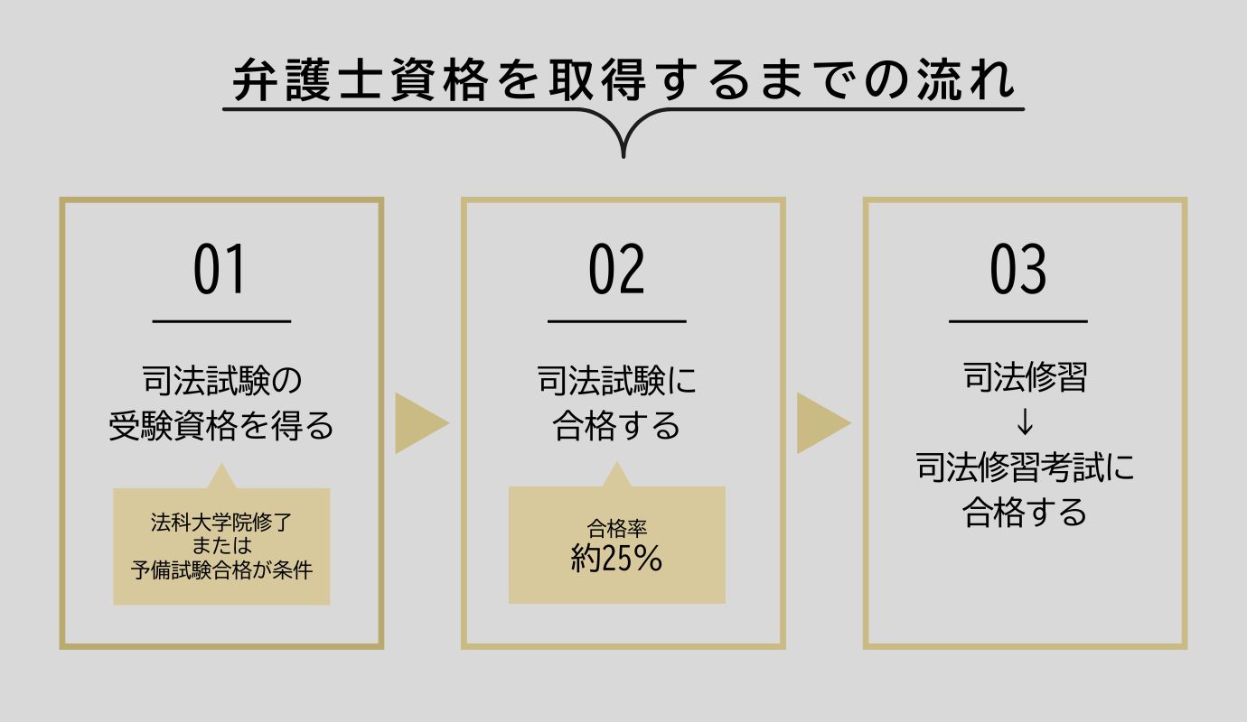 - 司法試験の受験資格を取得する(法科大学院で2年または3年学ぶか、司法試験予備試験に合格する)