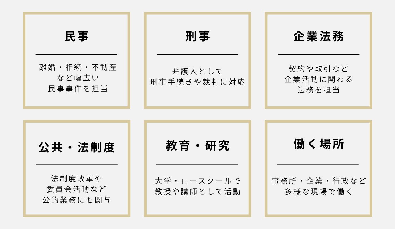 また活動の場として代表的なのは弁護士事務所ですが、企業や行政庁の職員・役員、大学・ロースクールで教授や講師を務める方も多く、幅広い現場で目にするでしょう。