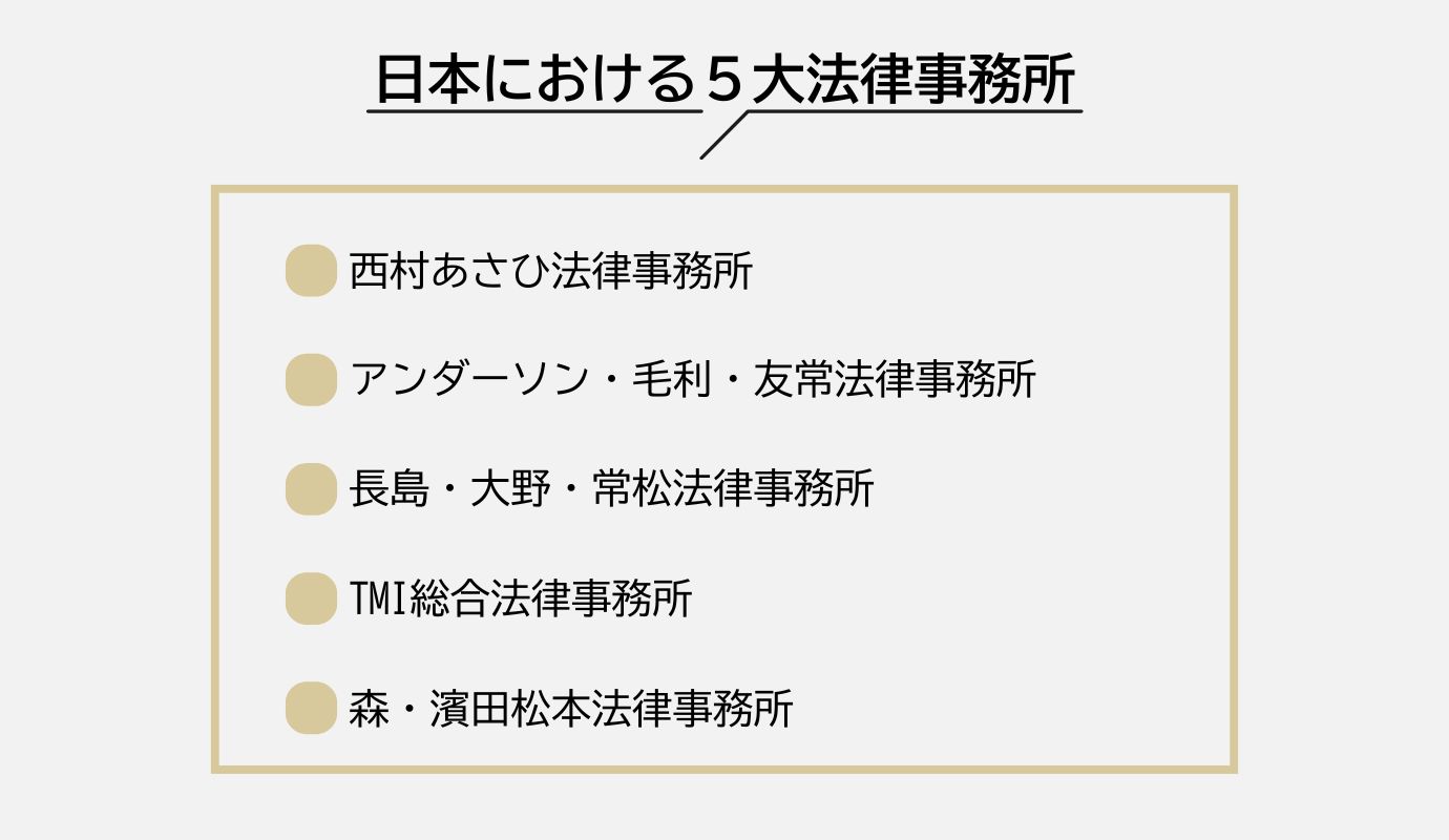 日本全国に弁護士事務所は数多くありますが、その中でも、所属弁護士数が多い上位5事務所のことを「5大法律事務所」と呼ぶことがあります。日本における5大法律事務所は、「西村あさひ法律事務所」、「アンダーソン・毛利・友常法律事務所」、「長島・大野・常松法律事務所」、「TMI総合法律事務所」、「森・濱田松本法律事務所」の5事務所を指します。