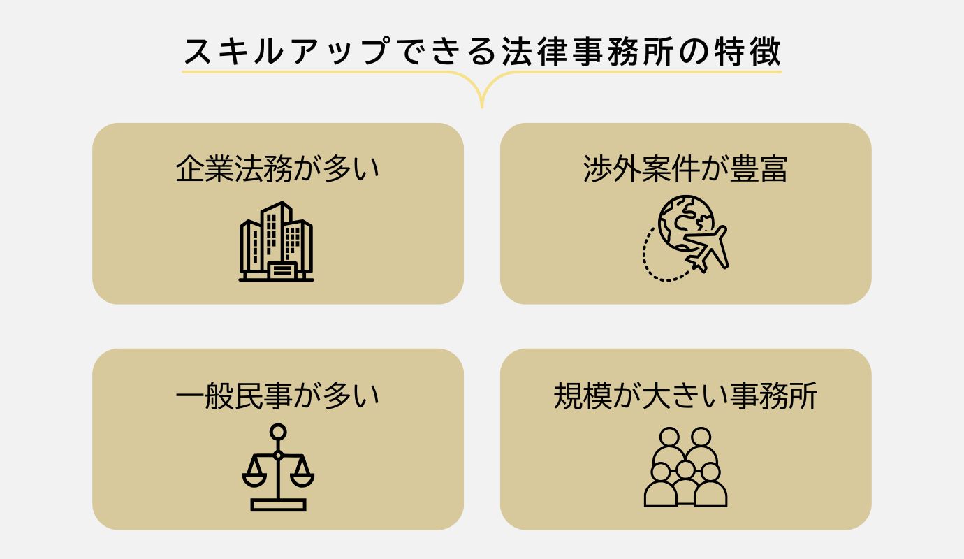 企業法務案件を多く取り扱っている法律事務所では、スキルアップに向いているといえます。